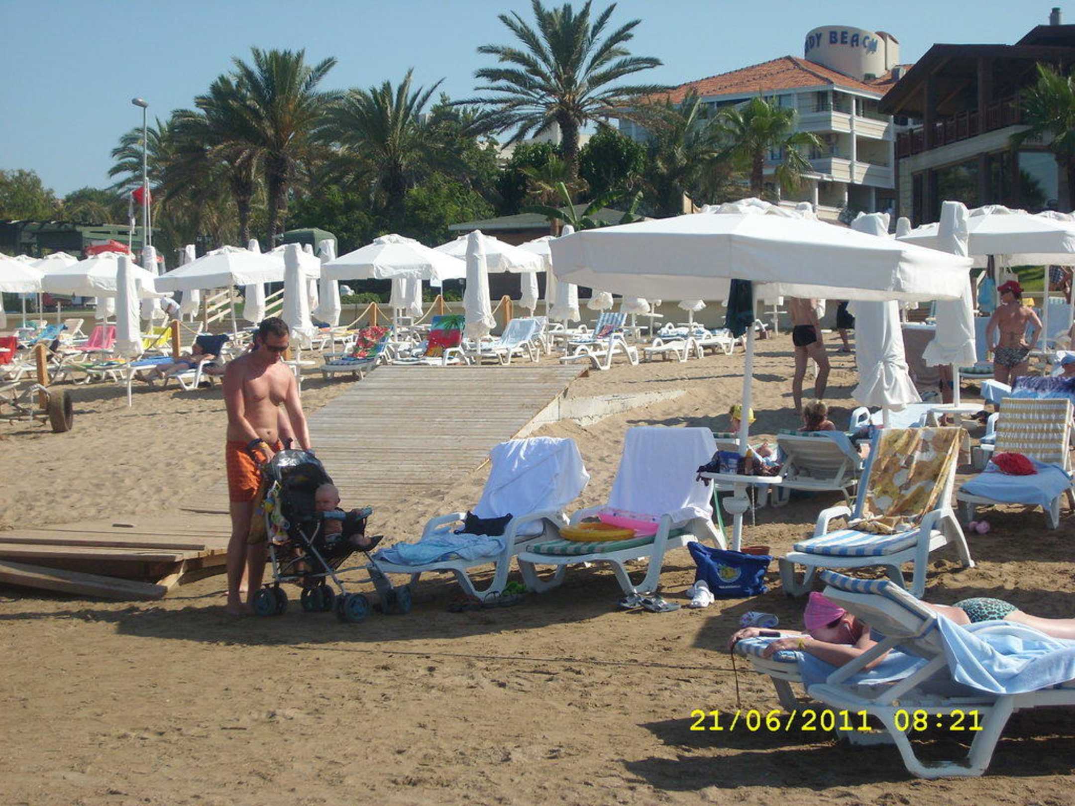 Pláž s lehátky a slunečníky