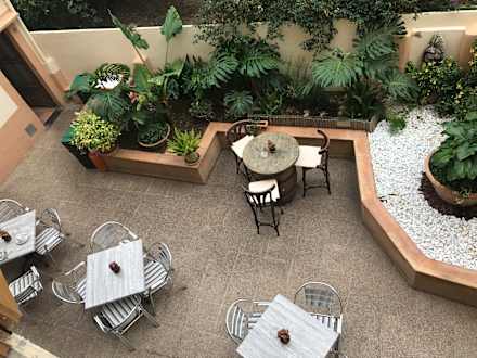 GastroBlick vom Zimmer in den Innenhof - auf den Außenbereich der Bar, wo auch das Frühstück eingenommen werden kann