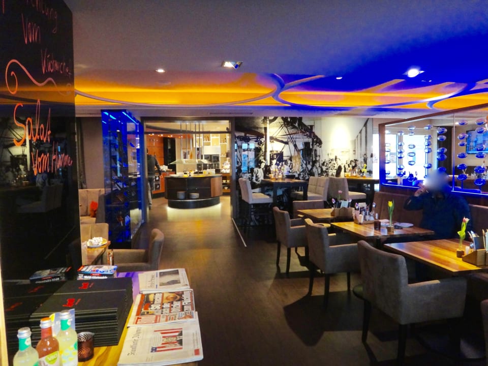 Blick zum Frühstücksbüffet, sieht schick aus.