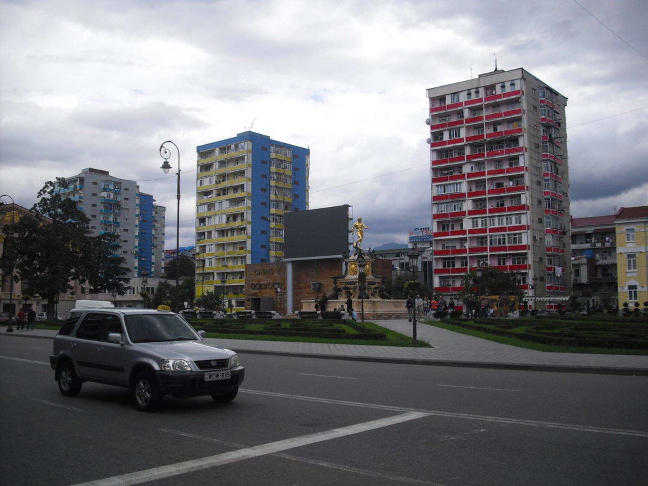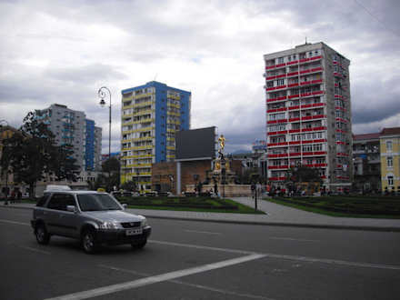 in der Mitte hinter den beiden Wohnblöcken