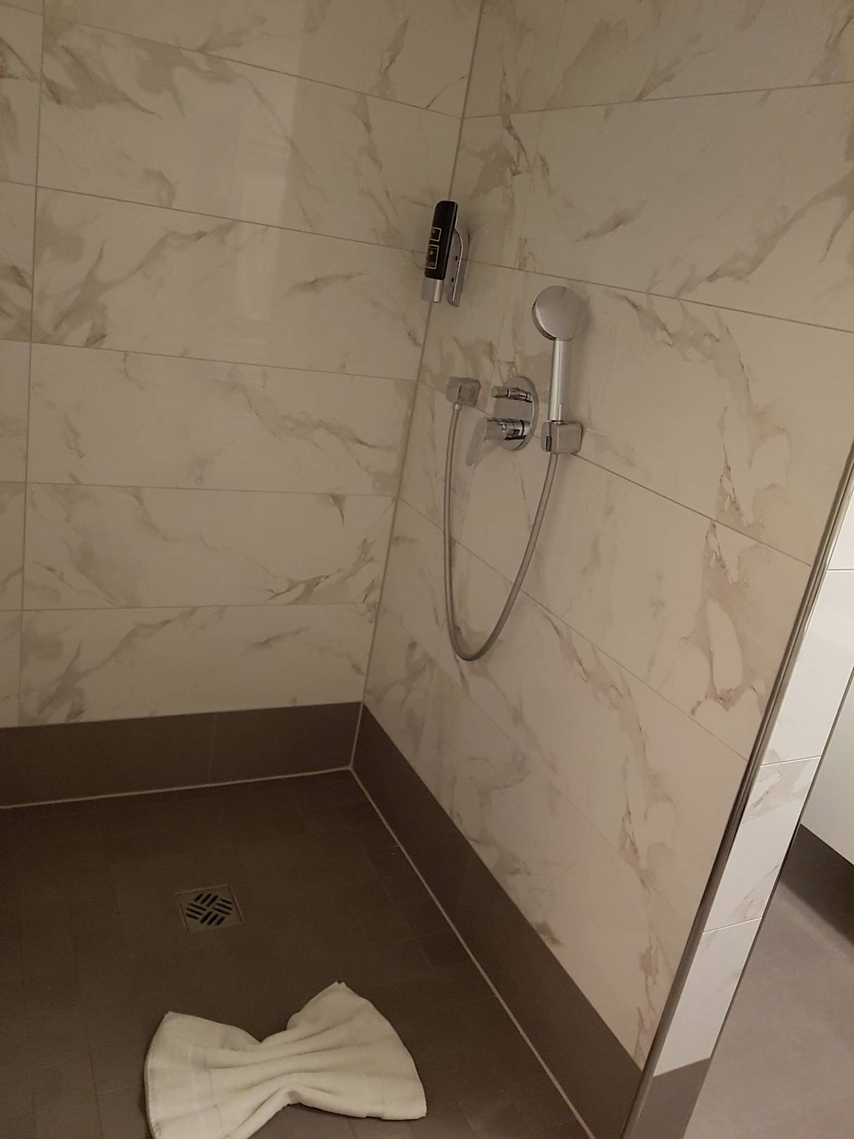 Dusche offen, groß, aber es sprtzt das Wasser bis an die Tür