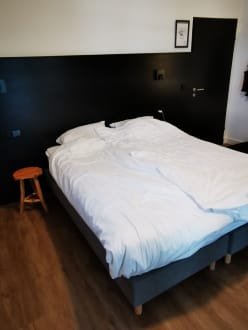 Keine Nachtische am Bett, nur alter Hocker.