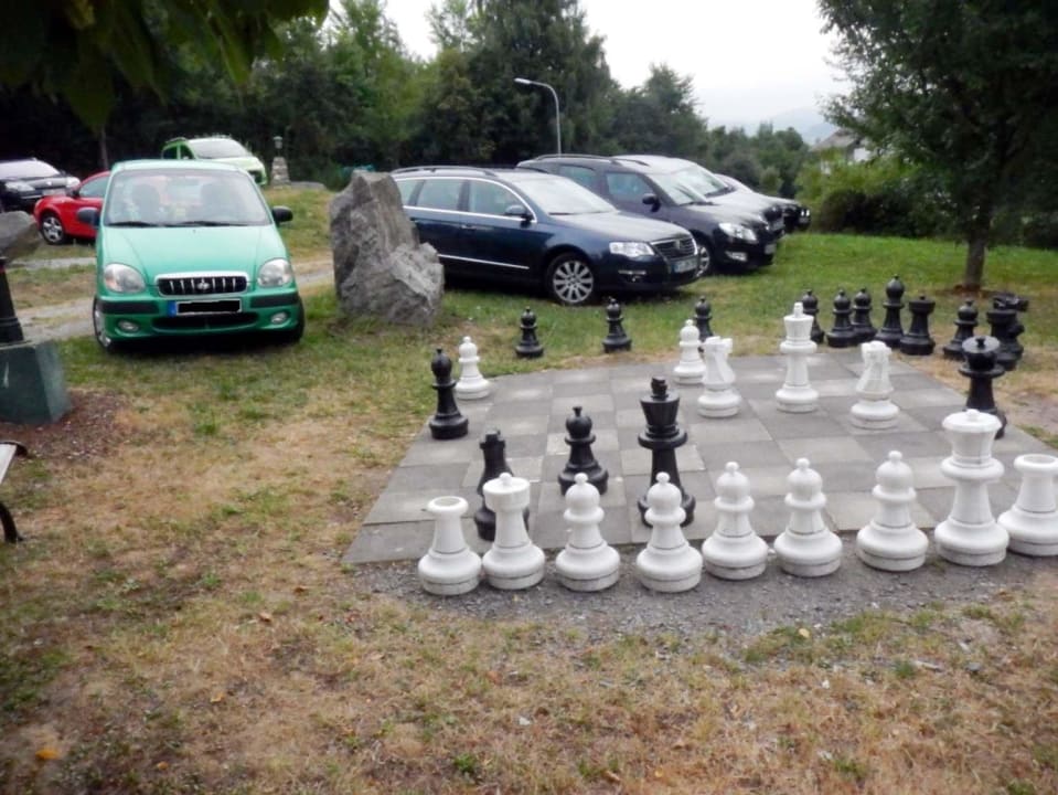 Schachspiel mit auf Wiese parkenden Autos