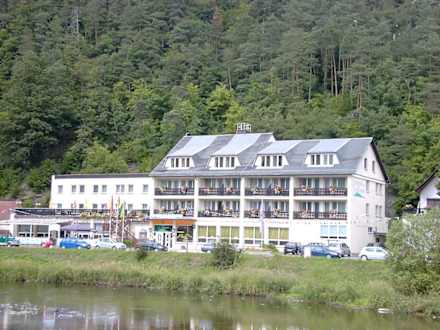 Ansicht des Hotels mit der Saale im Vordergrund.