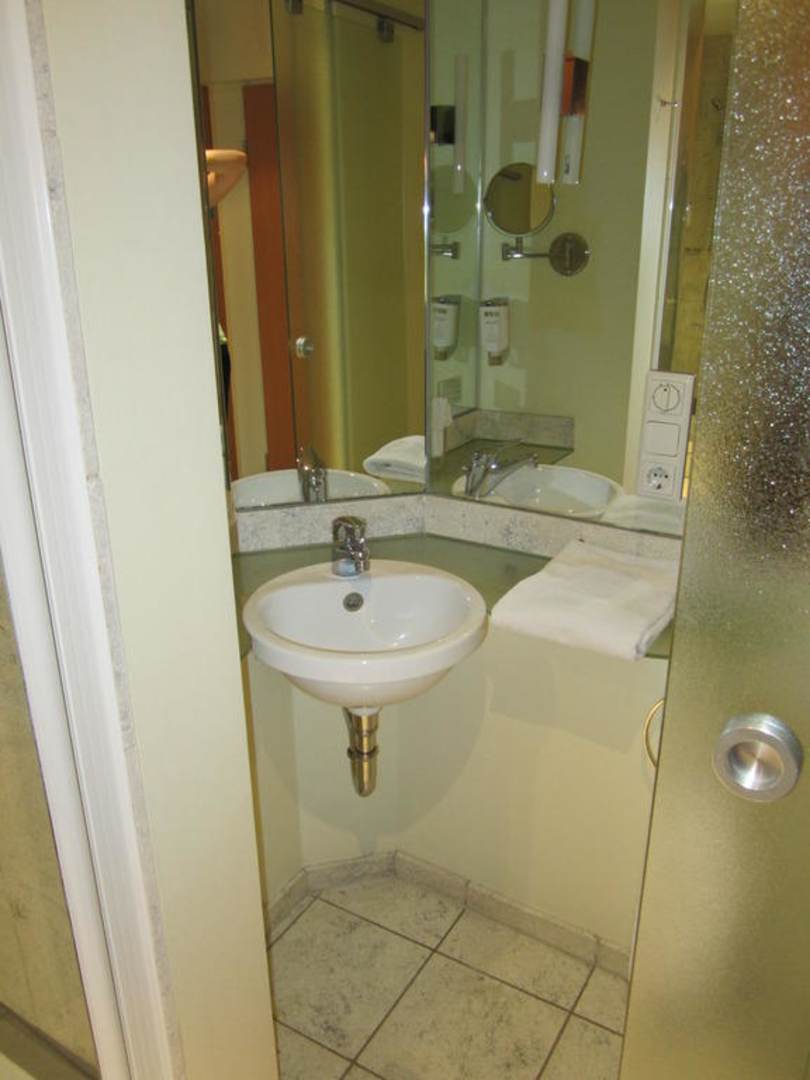 Hier ist das Bad des Zimmers zu sehen. Rechts neben dem Waschbecken ist noch eine Toilette zu finden. Abzutrennen ist der Bereich durch eine gläserne Schiebetür.