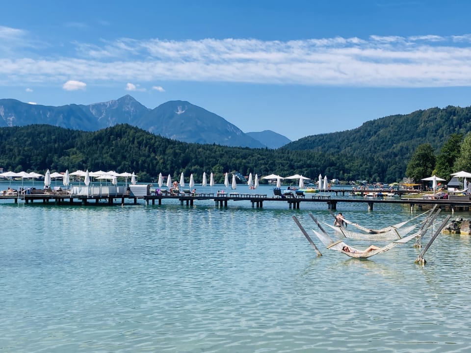 Blick vom Steg auf den See mit Freizeitangeboten