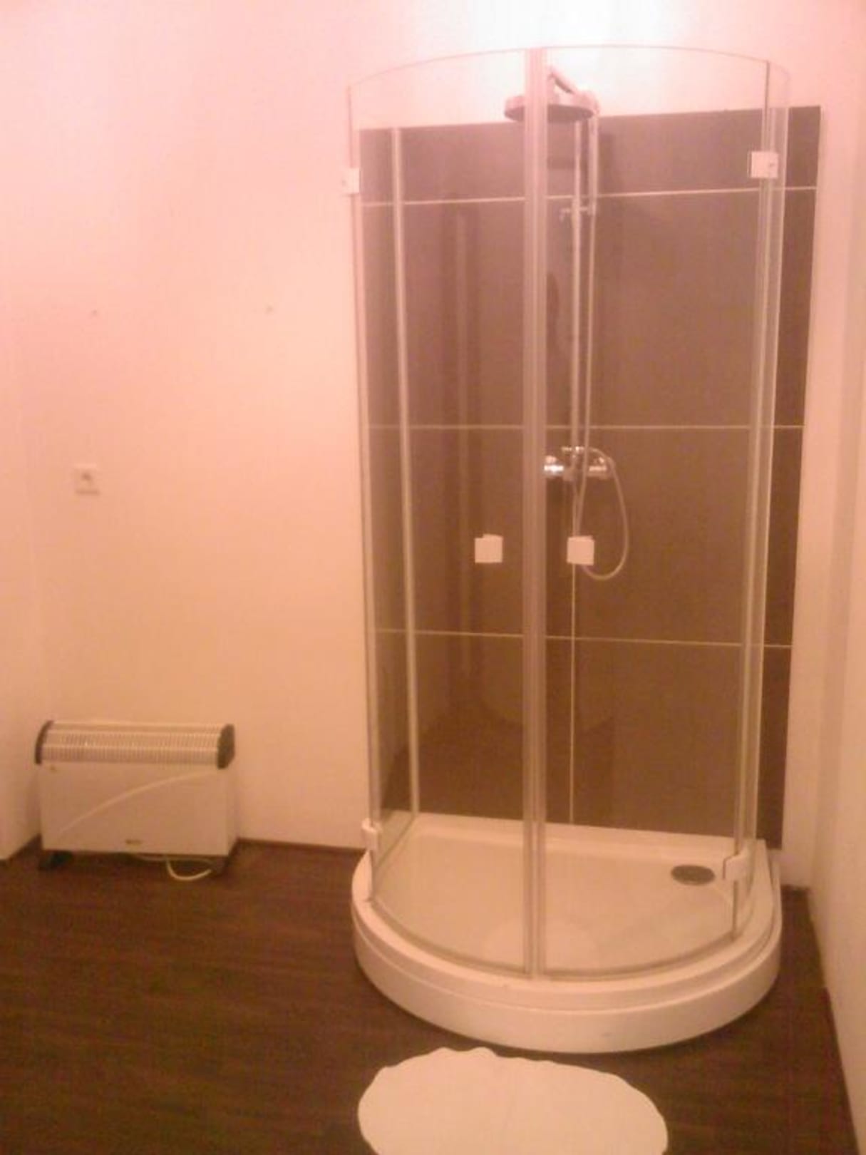 Die Dusche stand mitten im Raum wo sich auch der Kasten befand. Einen Handtuchhalter gab es nicht.