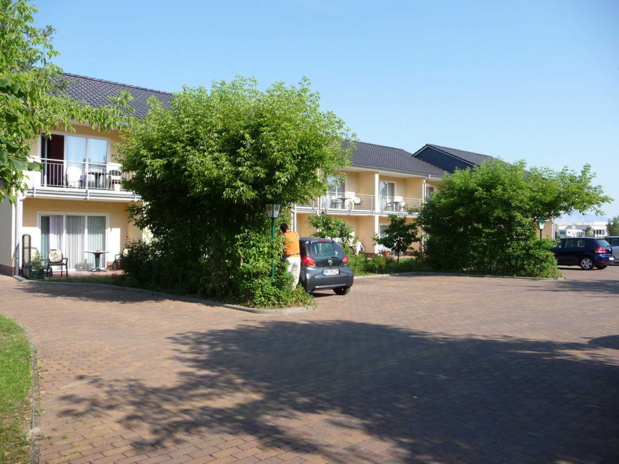 Parkplatz und hinteres Gebäude mit Appartments