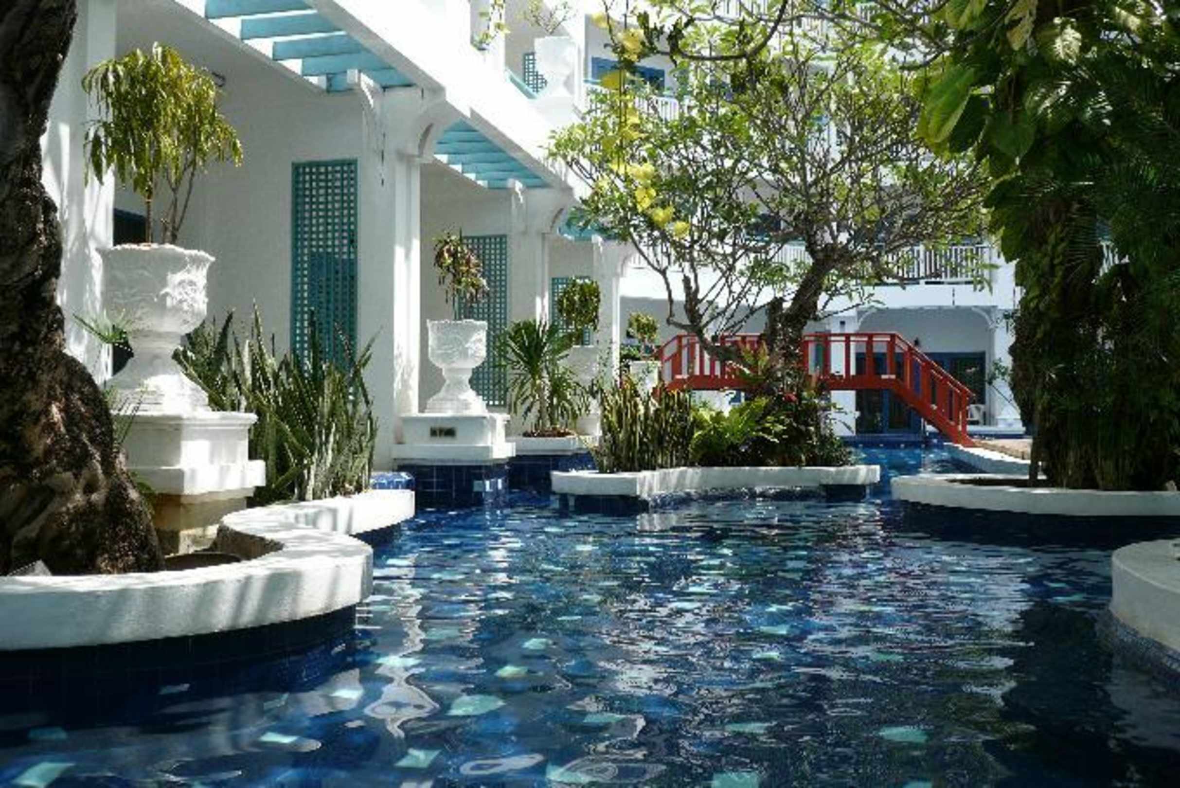 Direktzugang der Erdgeschoßzimmer zum Pool. Wunderschöne Gestaltung mit Bäumen und Blumen