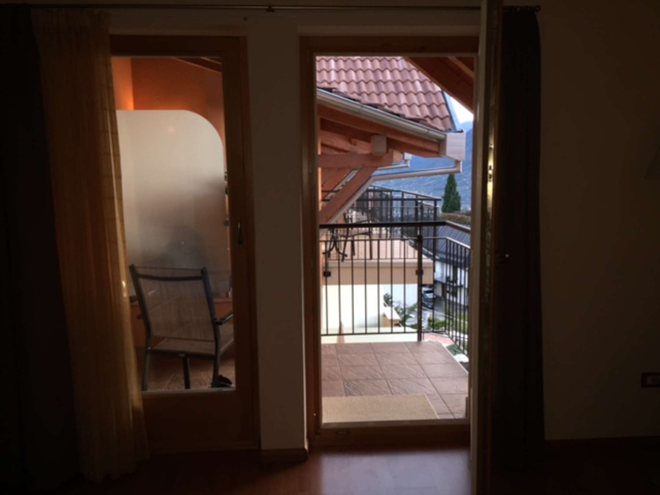 Blick aus der dunklen "Romantik Suite" auf andere Balkone