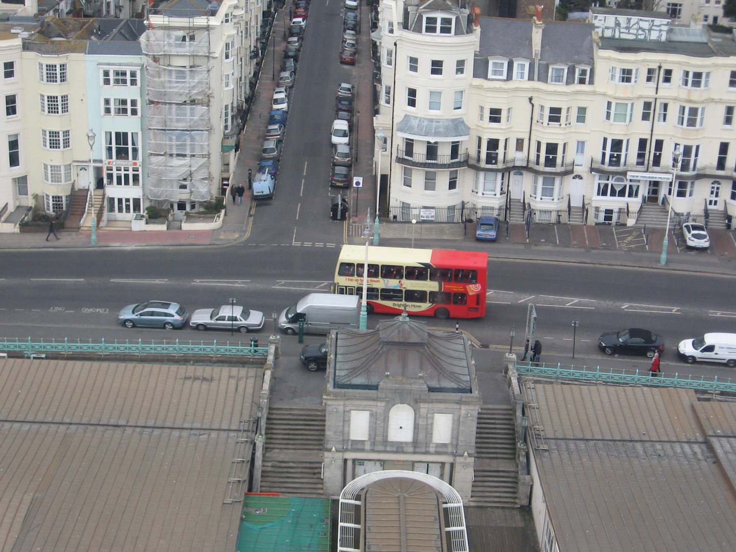 Blick vom RiesenradBlick vom Riesenrad auf das von außen unscheinbar wirkende (hellgrün) Hotel links im Bild. Das Hotel liegt direkt am Meer und zum Omnibusbahnhof POOL VALLEY (Busverbindung zum Airport London Gatwick) sind es nur einige Schritte. Man braucht kein Taxi