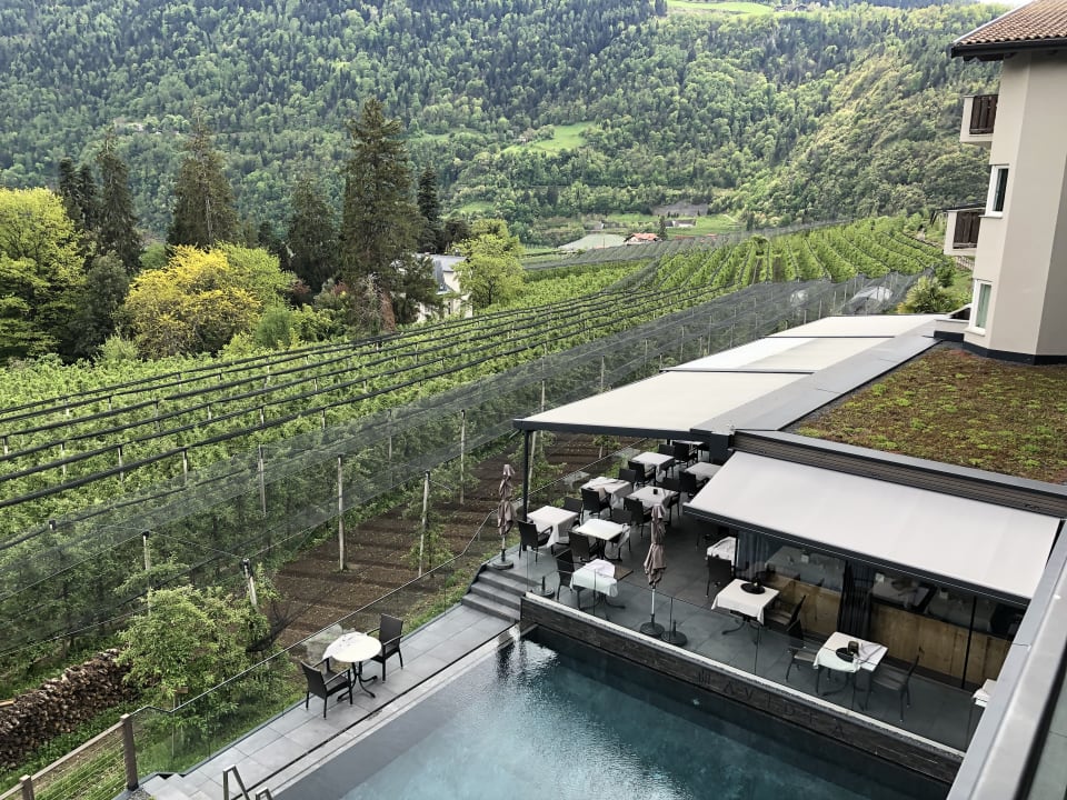 Blick vom Zimmer auf den Pool und Sonnenterrasse