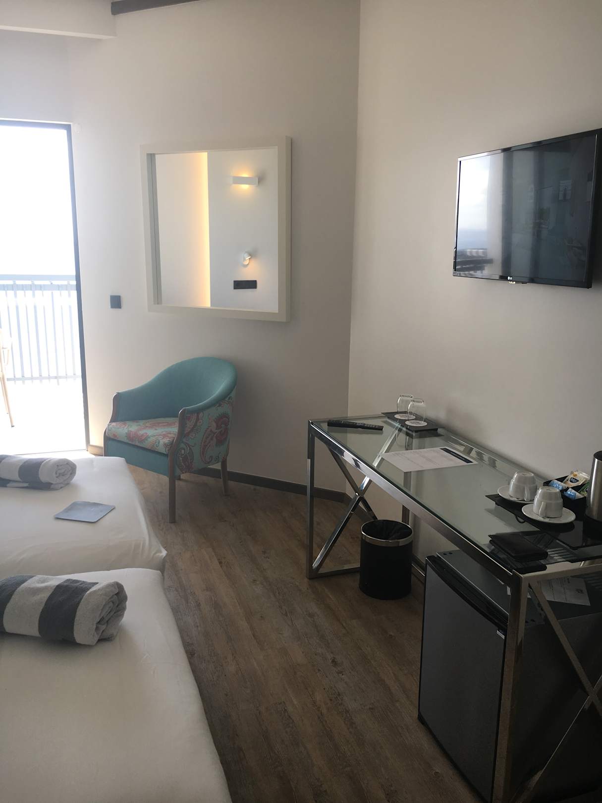Sessel, Tisch, TV und Minibar