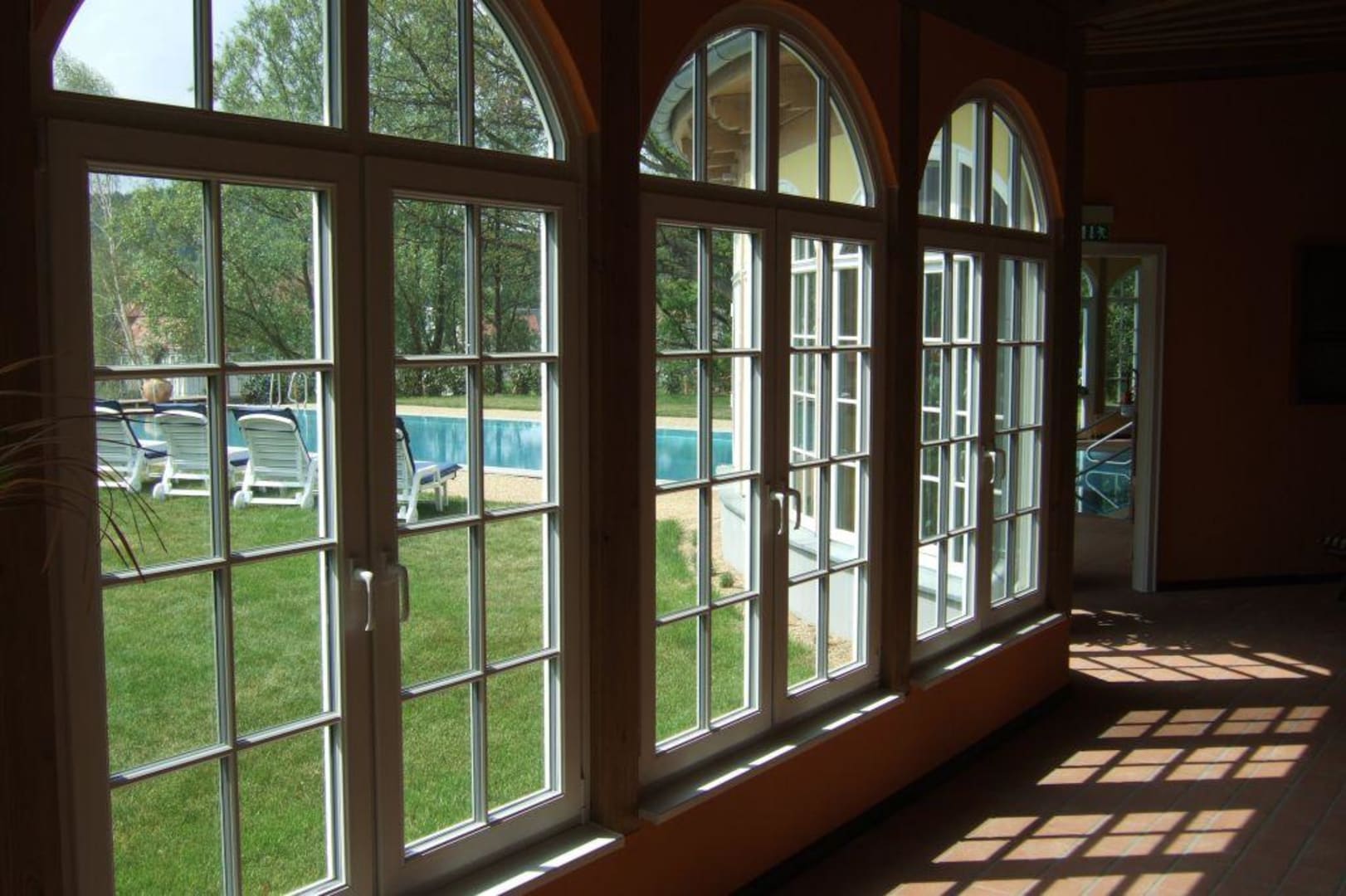 Wintergarten mit Sicht auf Außenpool.