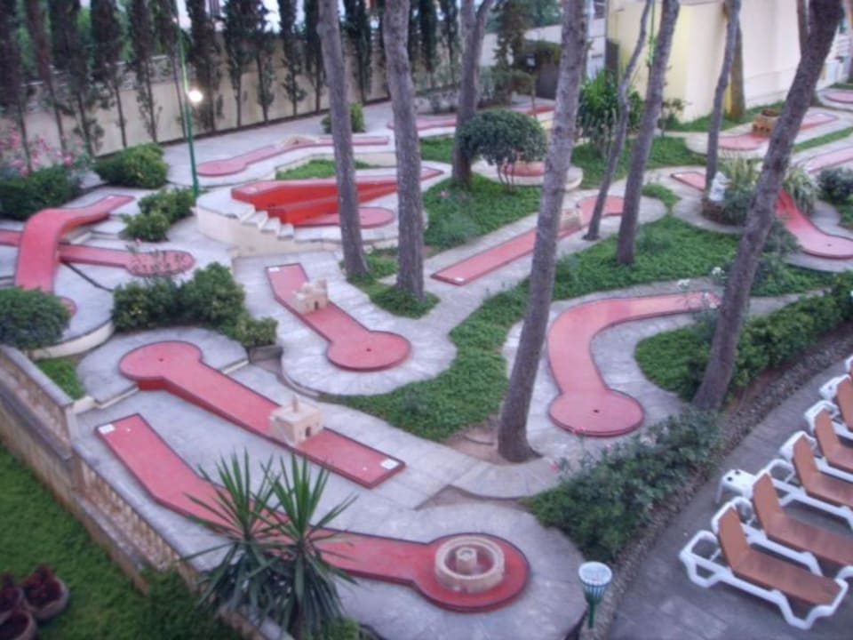 Minigolfanlage die zu Hotel gehört, aufgenommen vom Zimmer 354 im Nebenhaus