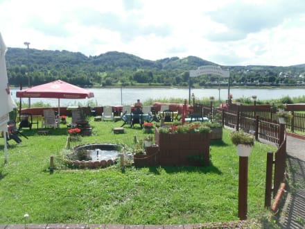 Biergarten mit Teich und Rheinblick
