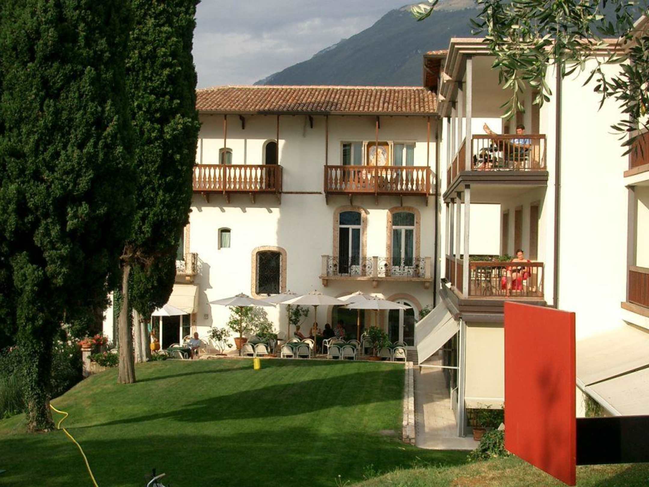 Haupthaus von hintengerade: Bar außen, morgens Frühstück, links: wäre der Gardasee