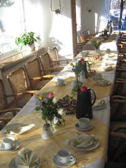gedeckte Kaffeetafel im gemütlichen und hellen Frühstücksraum