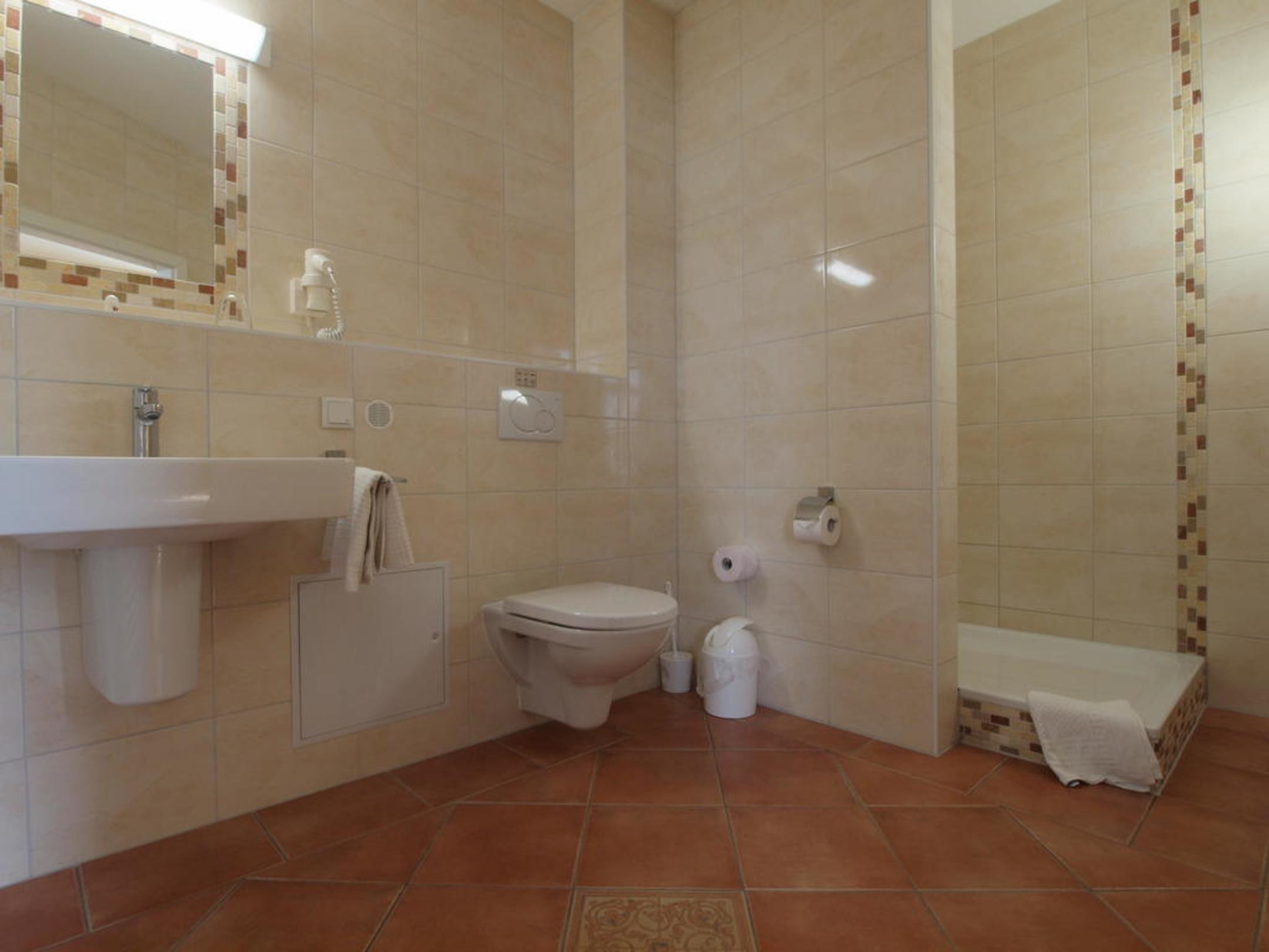 Grosszügiges Badezimmer zu dem ebenerdigen 40qm grossen Zimmer Nr. 15