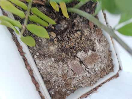 Verschimmelte Erde in den Gefäßen im Speisesaal aus denen kleine Fliegen kommen.