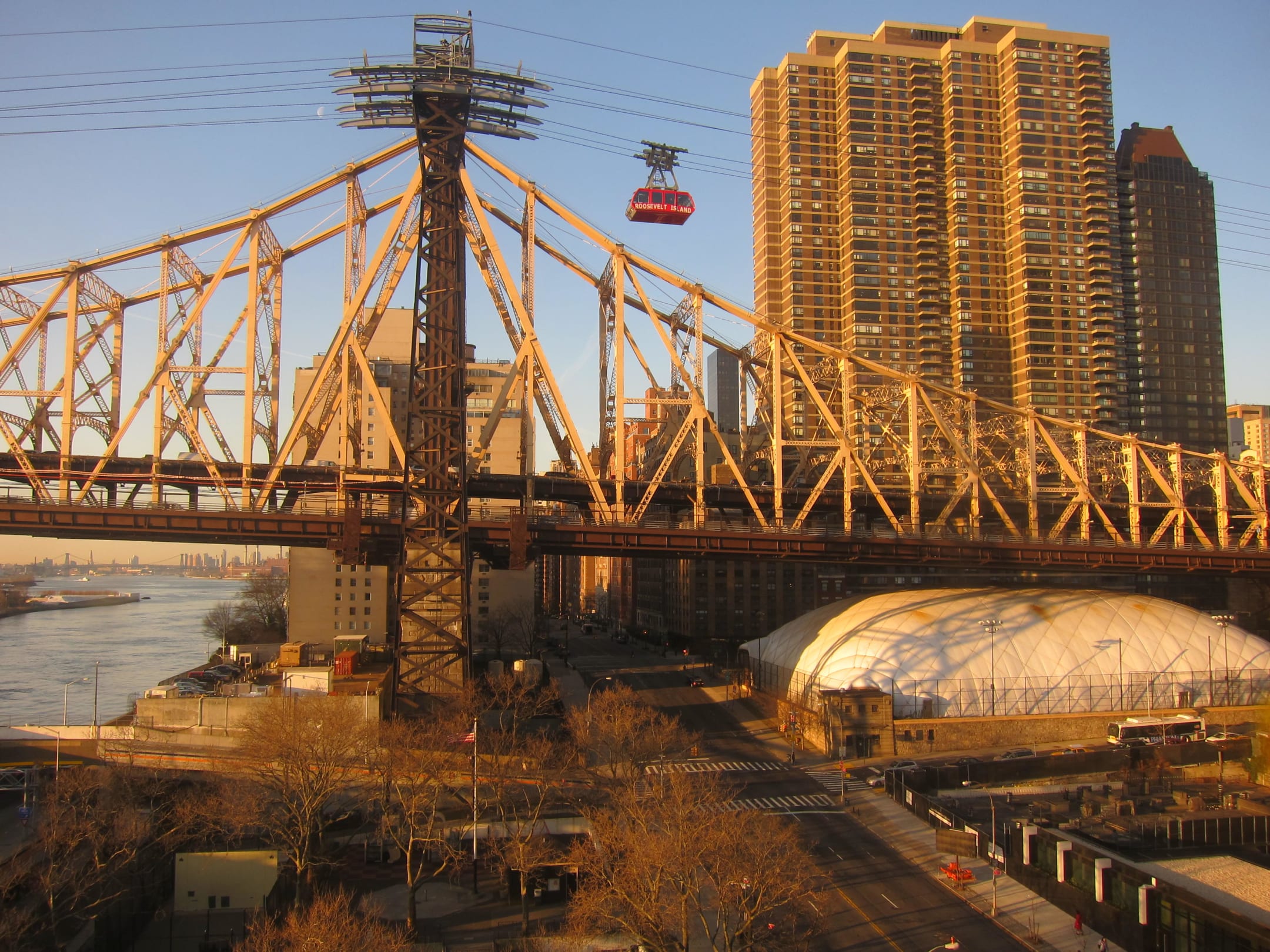 Im Licht der aufgehenden Sonne hatten wir einen schönen Blick auf die Queensboro Bridge und den East River. In der Mitte verläuft die York Avenue in Richtung Sutton Place. Oben eine Gondel der Roosevelt Tram.