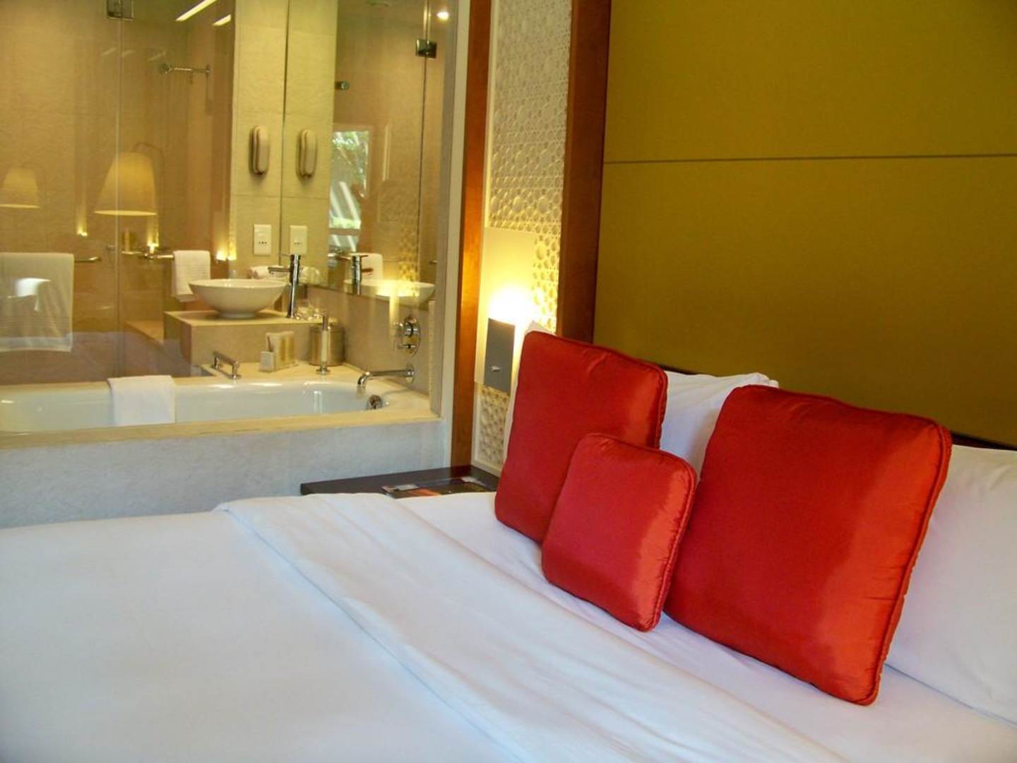 Das Bett mit dem Bad im Hintergrund