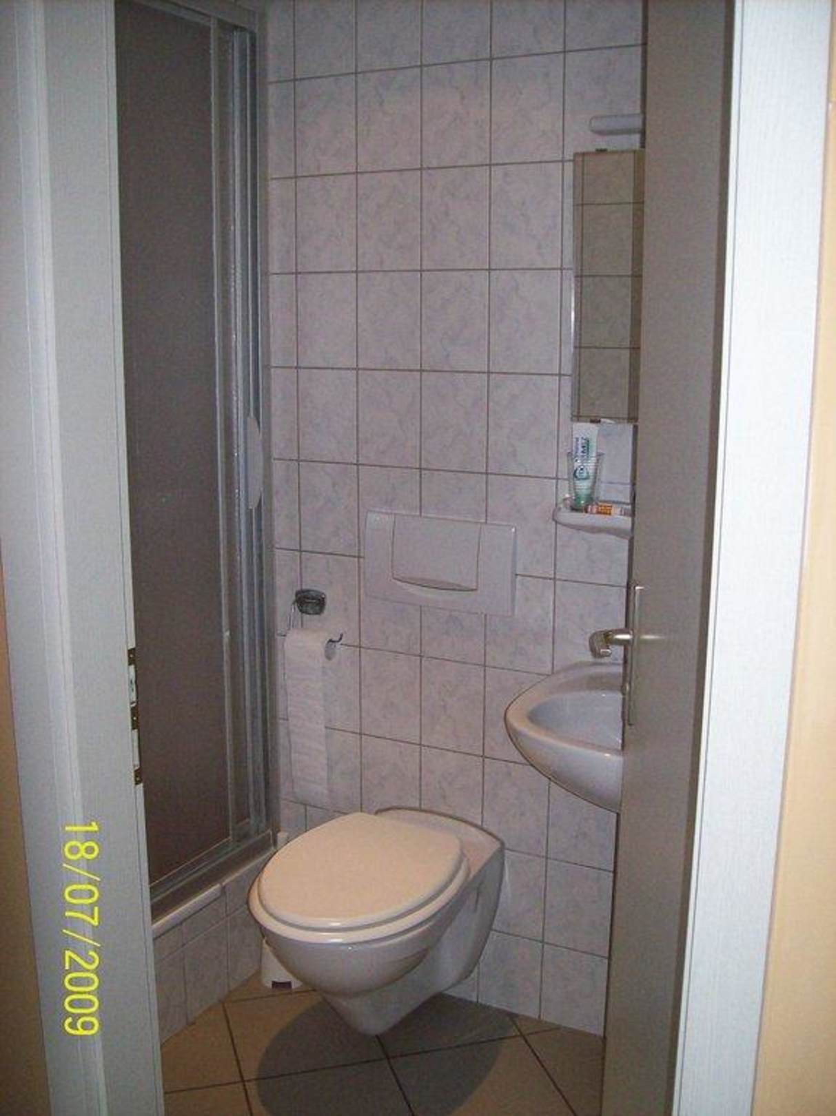 Links die Dusche, rechts hinter der Tür das Waschbecken; die Tür geht nicht weiter auf, also--> reintreten - Tür schließen- vor das Waschbecken stellen