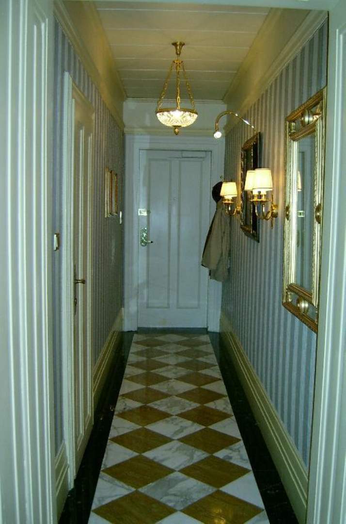 Flur im Doppelzimmer, mit Marmorboden und Stoffbespannung.