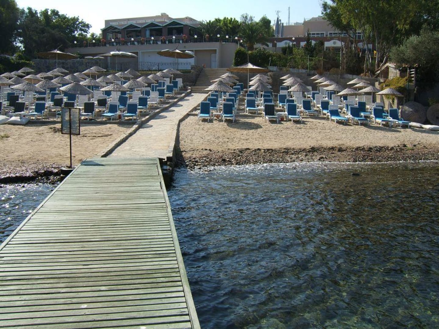 Blick vom Bootssteg zurück - auf den terrassenförmig angelegten Strand.