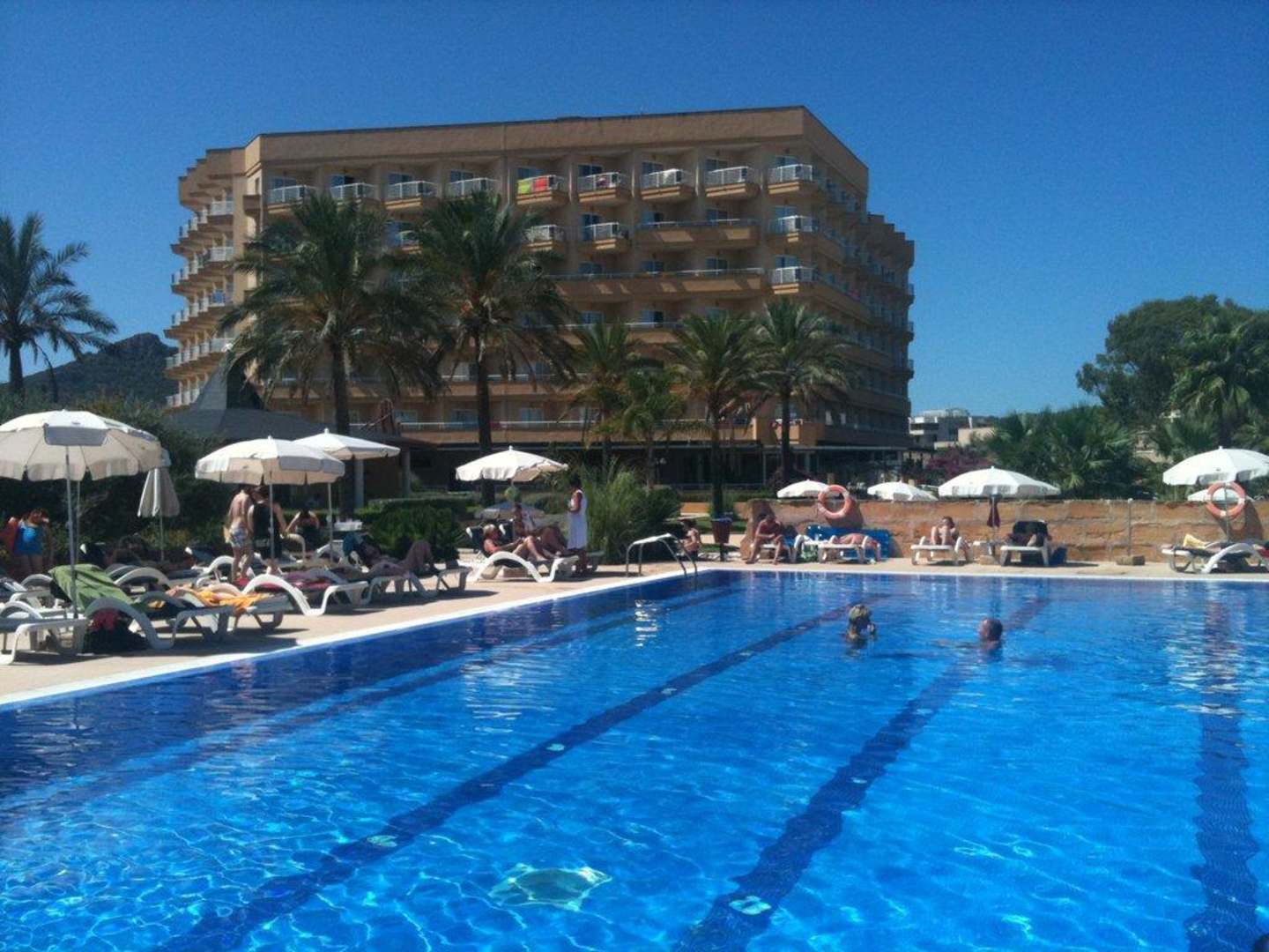 großer Pool mit Hotel im Hintergrund