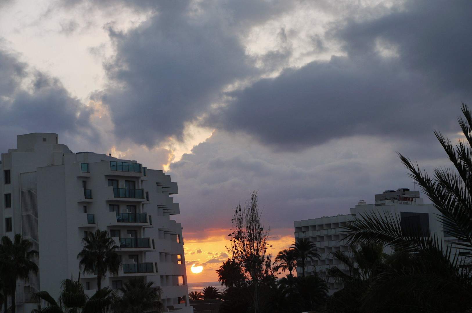 Blick vom Balkon: Sonne geht überm Meer auf.