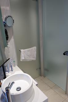 ZimmerNeus offenes Badzimmer - hinter der mittleren Glastür = begehbare Dusche mit Regendusche - rechte Milchglastür = WC