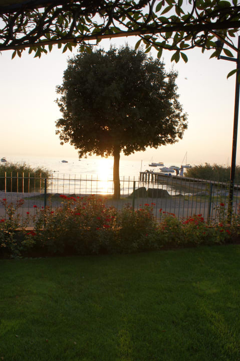 Blick vom Hotelgarten auf den Strand und den Steg