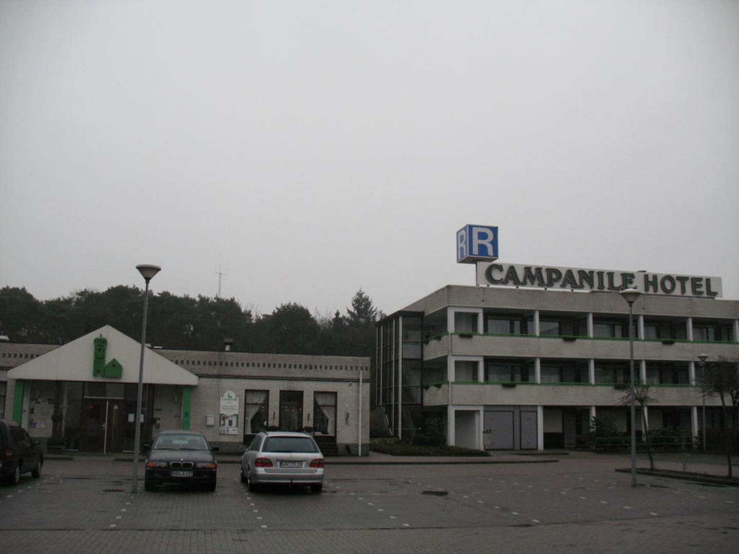links Rezeption und Restaurant, rechts die Wohnanlage; wir haben weitere Hotels in dieser Art gesehen, vielleicht ist das typisch in den Niederlanden das Zimmer und Empfang getrennt sind?! vorne Parkplatz