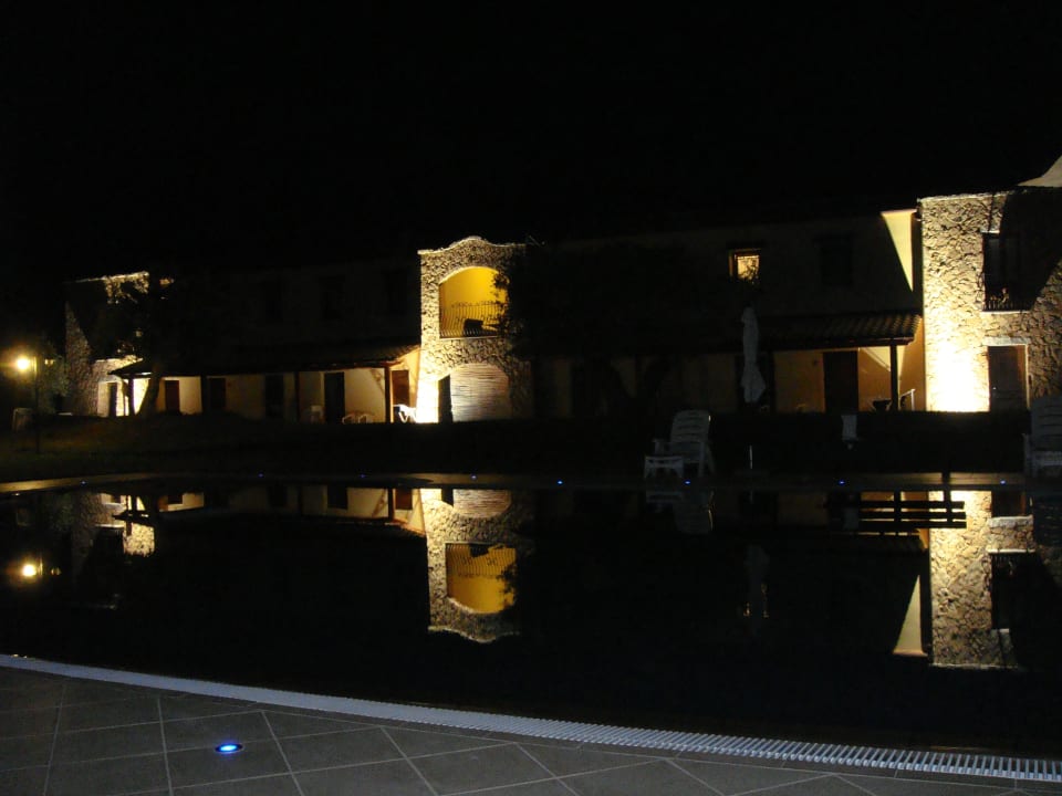 Zimmertrakt am Pool bei Nacht