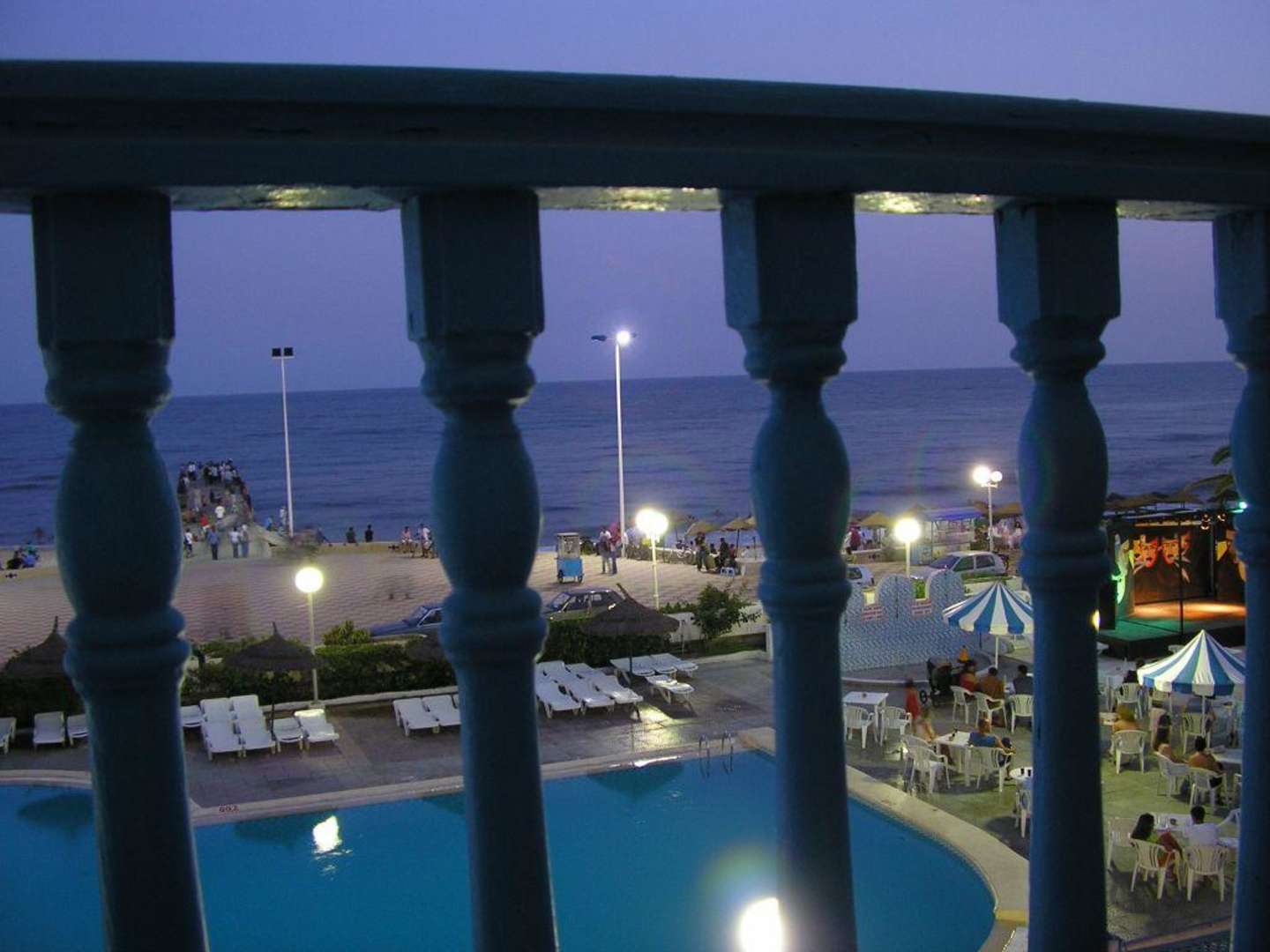 Unser Zimmerausblick durchs Balkongitter mit Pool, Steg und Meer