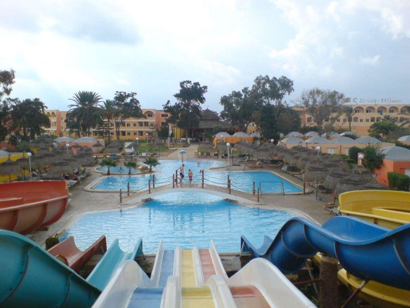 Blick von der Rutsche auf die Poolanlage