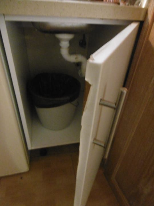 Tür unter der Spüle mit abgerissener Beschichtung.