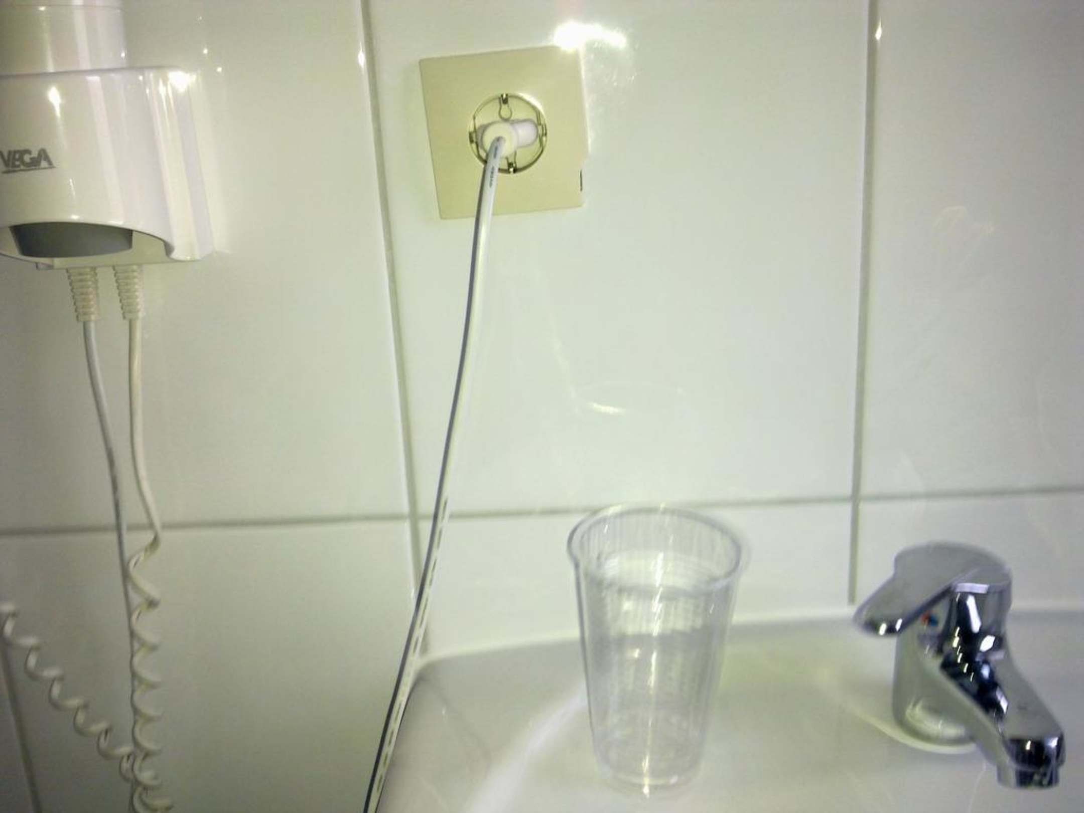 Plastikbecher im Bad!Das hatte ich auch noch nicht. Ein Plastikbecher im Bad. Die Steckdose in der Wand ist rechts unten defekt. Spritzt da Wasser rein gibts einen Kurzschluß - wenn man Glück hat !