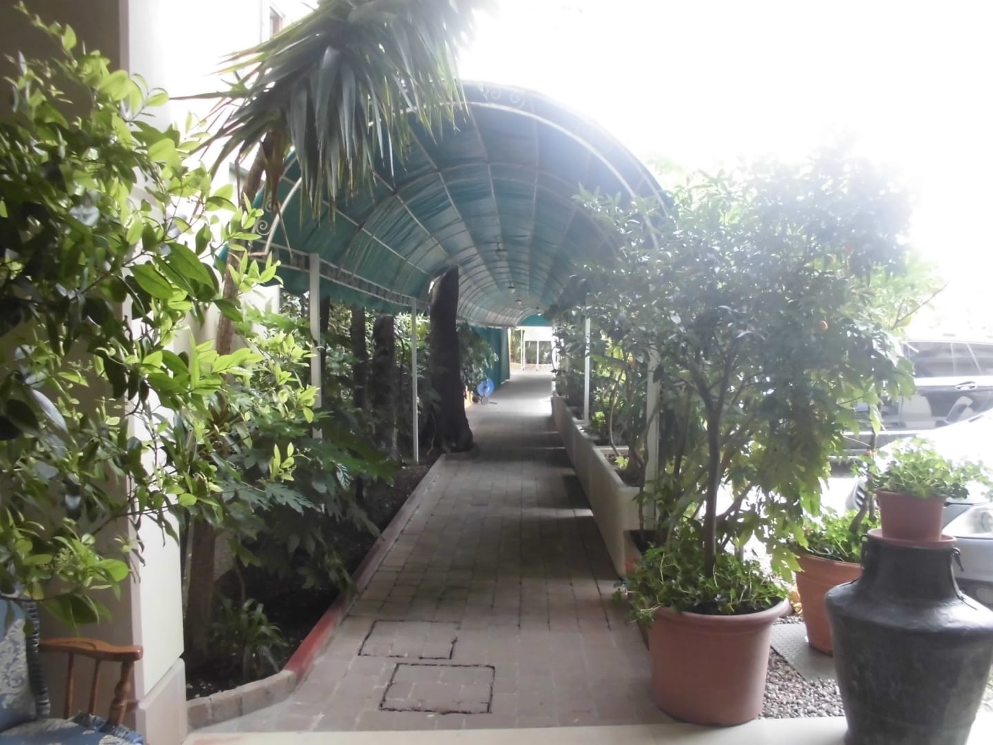 Gang vom neuen zum alten Bereich, rechts der Parkplatz