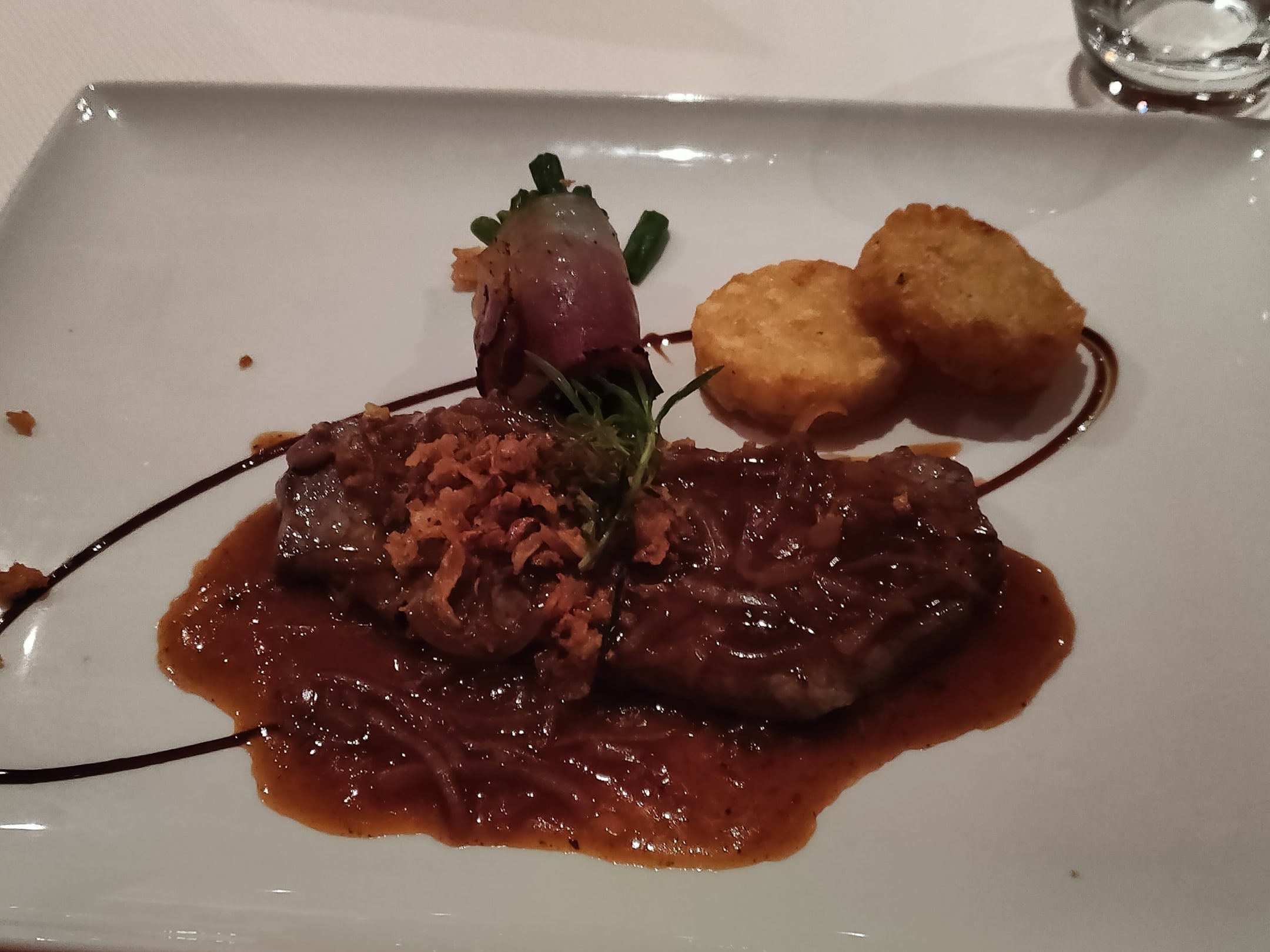 Zwiebelrostbraten mit Speckbohnen und Kartoffelplätzchen. Butterzart und die Soße🤤🤤🤤