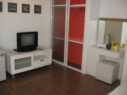 Холодильник, шкаф, зеркало и удобный пуфик и приятная прохлада номера