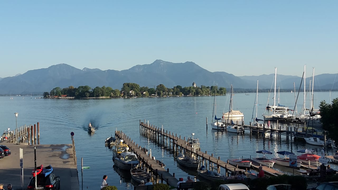 Bergpanorama und Fraueninsel von der Hotelterrasse aus.