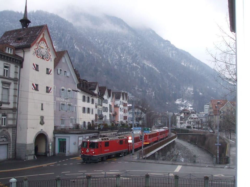 Blick auf einen Teil der Altstadt von ChurDiese Aufnahme entstand am Sonntagmorgen des 25. Januar 2009 und zeigt den Blick aus dem Fenster von Zimmer 223 im Hotel Chur auf einen Teil der Altstadt (das Obertor). Ferner ist auf dem Foto der herannahende Zug aus Richtung Arosa zu erkennen, der Chur mit diesem "zauberhaften" Ort am Ende eines Hochgebirgstals verbindet.