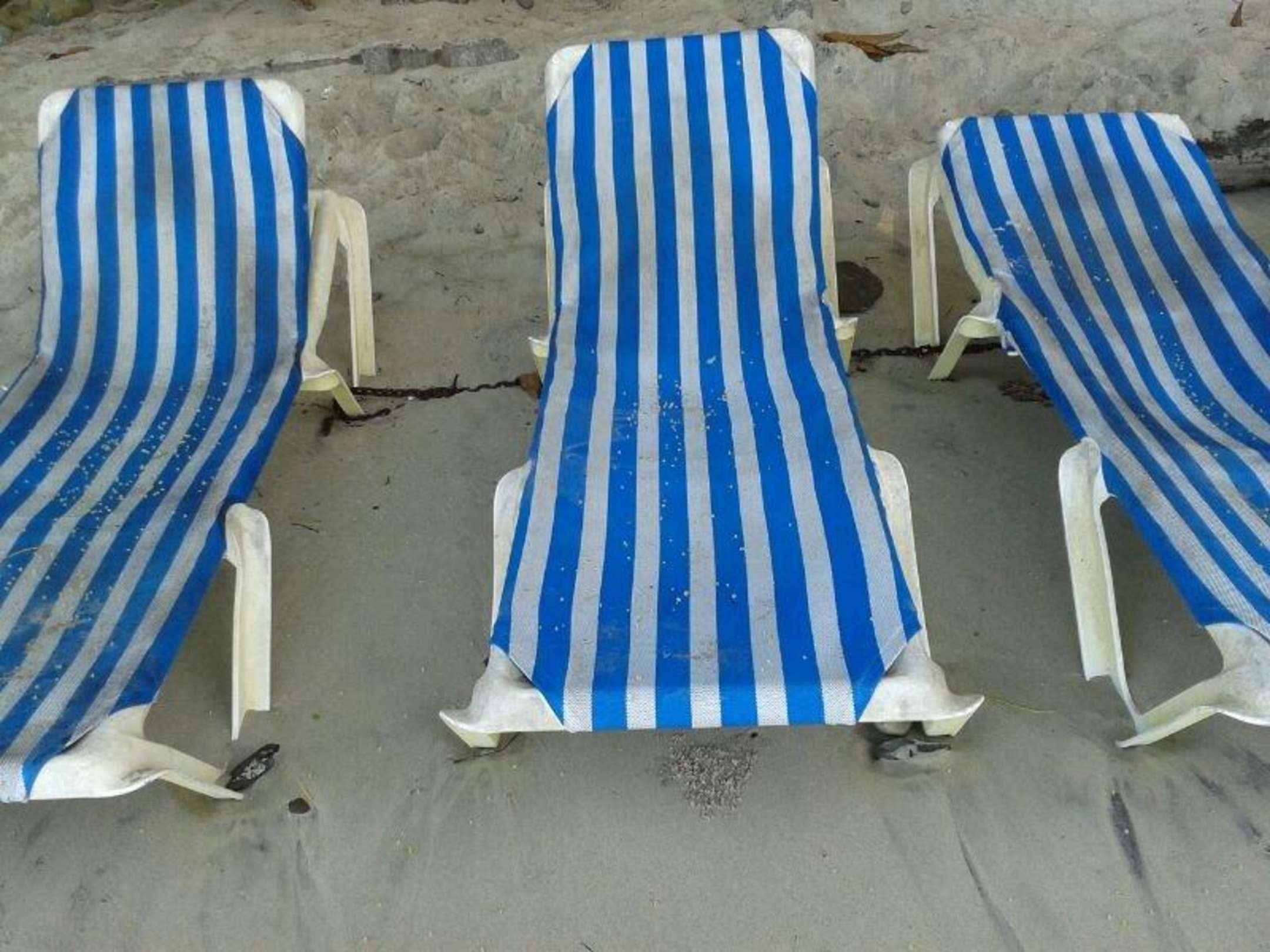 Strandliegen Playa BlancaDie ca. 20 Strandliegen am Hotelstrand PlayaBlanca sind angekettet durchgelegen und völlig verwahrlost.