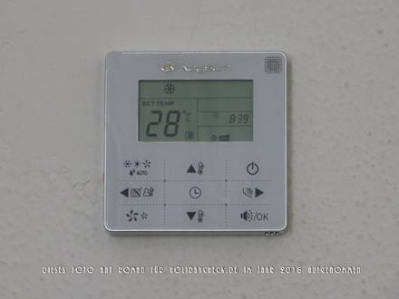 ZimmerDas Bedienpanel der Klimaanlage. Das Höherstellen der Temperatur veranlasst nicht die Aktivierung der Heizung, da das Sonnensymbol fehlt und die Schneeflocke sichtbar ist.