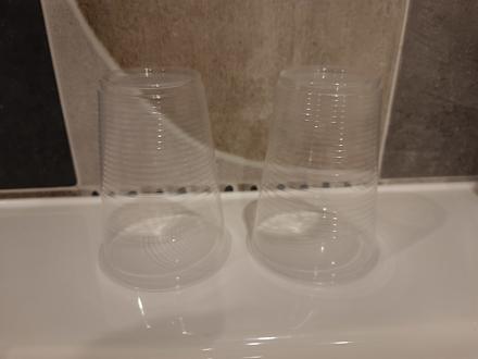 Plastik-Gläser am Waschbecken