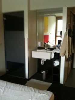 SanitärbereichGleich neben dem Bett: Waschbecken und Tür zur Duschkabine (mit Spuren von Überschwemmungen auf dem Teppichboden)