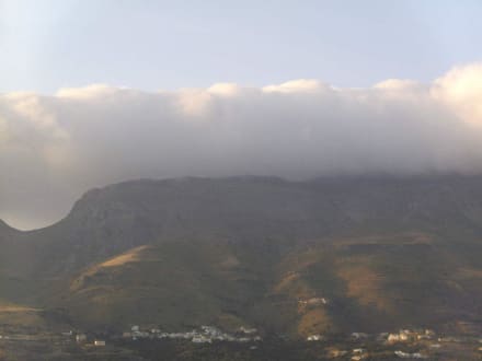 Blick vom Hotel in die wolkenverhangenen Berge