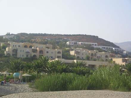 Widok hotelu od strony plażyhotel Damnoni Bay od strony plaży różowe budynki powyżej, na pierwszym planie Hapimag Resort